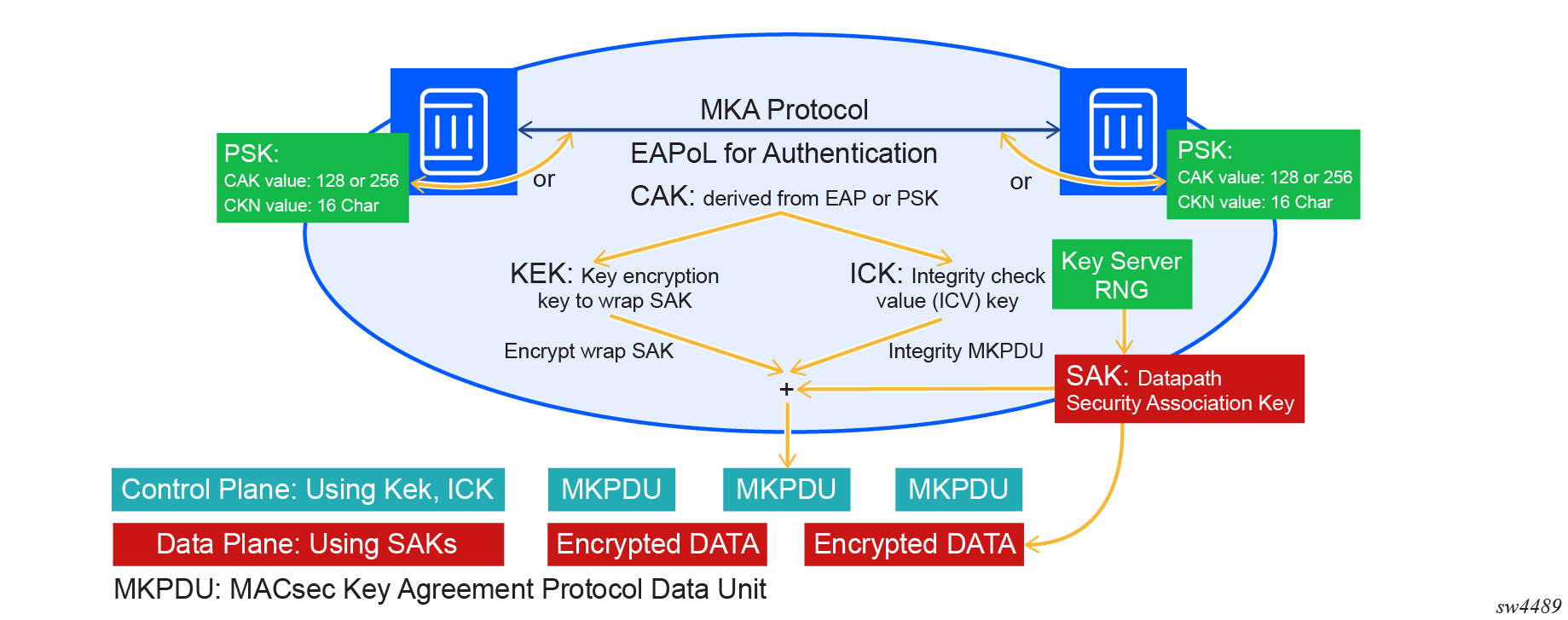 MACsec uses pre-shared key (PSK) to wrap the SAK. SAKs are generated and distributed by the key server in CA to encrypt data plane PDUs. The key server on the CA is negotiated through MACsec Key Agreement (MKA) protocol based on a configurable key server value.