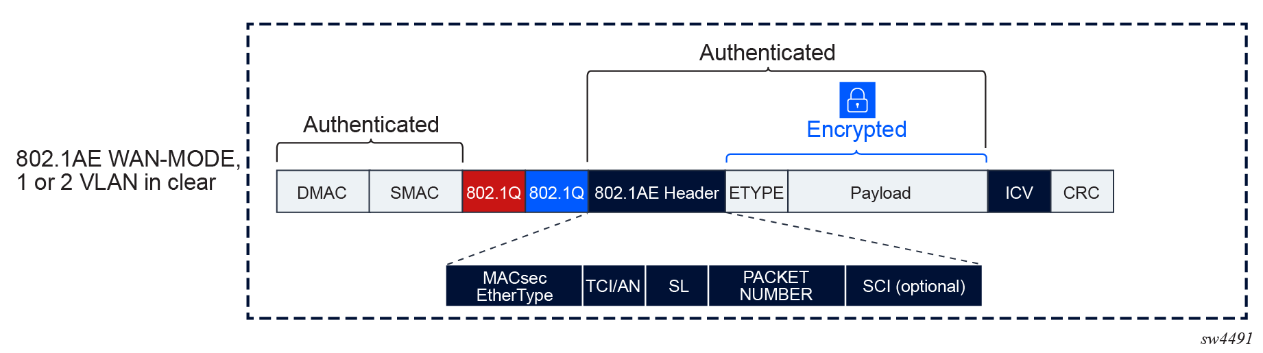 The original 802.1AE encrypts the 802.1Q and QinQ tags. In a WAN environment where the switching could be based on 802.1Q tag, Nokia recommends putting the 802.1Q in clear.