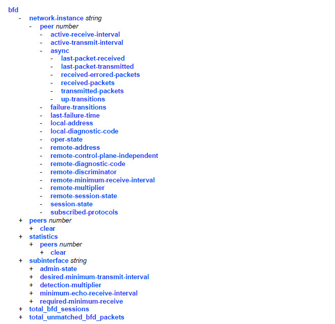 Syntax for each field is displayed in bold, followed by supported parameters and their type. In the example that follows, the bfd network-instance field shows that the parameter type is a string: