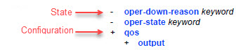 In the tree hierarchy, configuration transactions are denoted with a plus sign (+). State transactions are denoted with a minus sign (-). See Configuration/state in tree hierarchy.