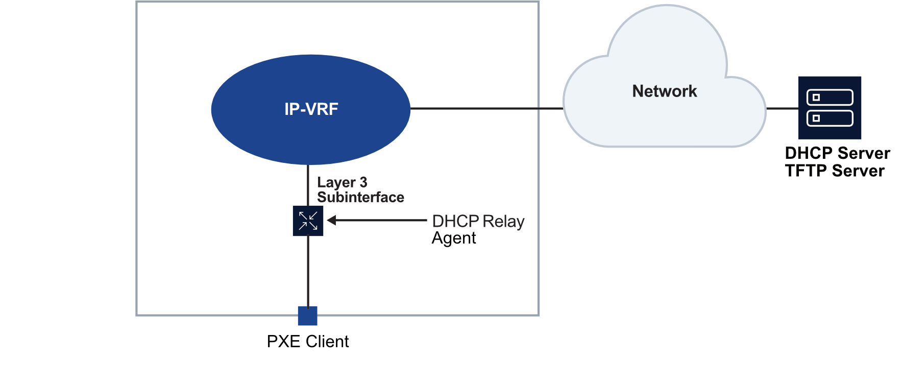 When the network client and DHCP server are on different subnets, DHCP relay is configured to forward messages between the PXE client and the DHCP server.