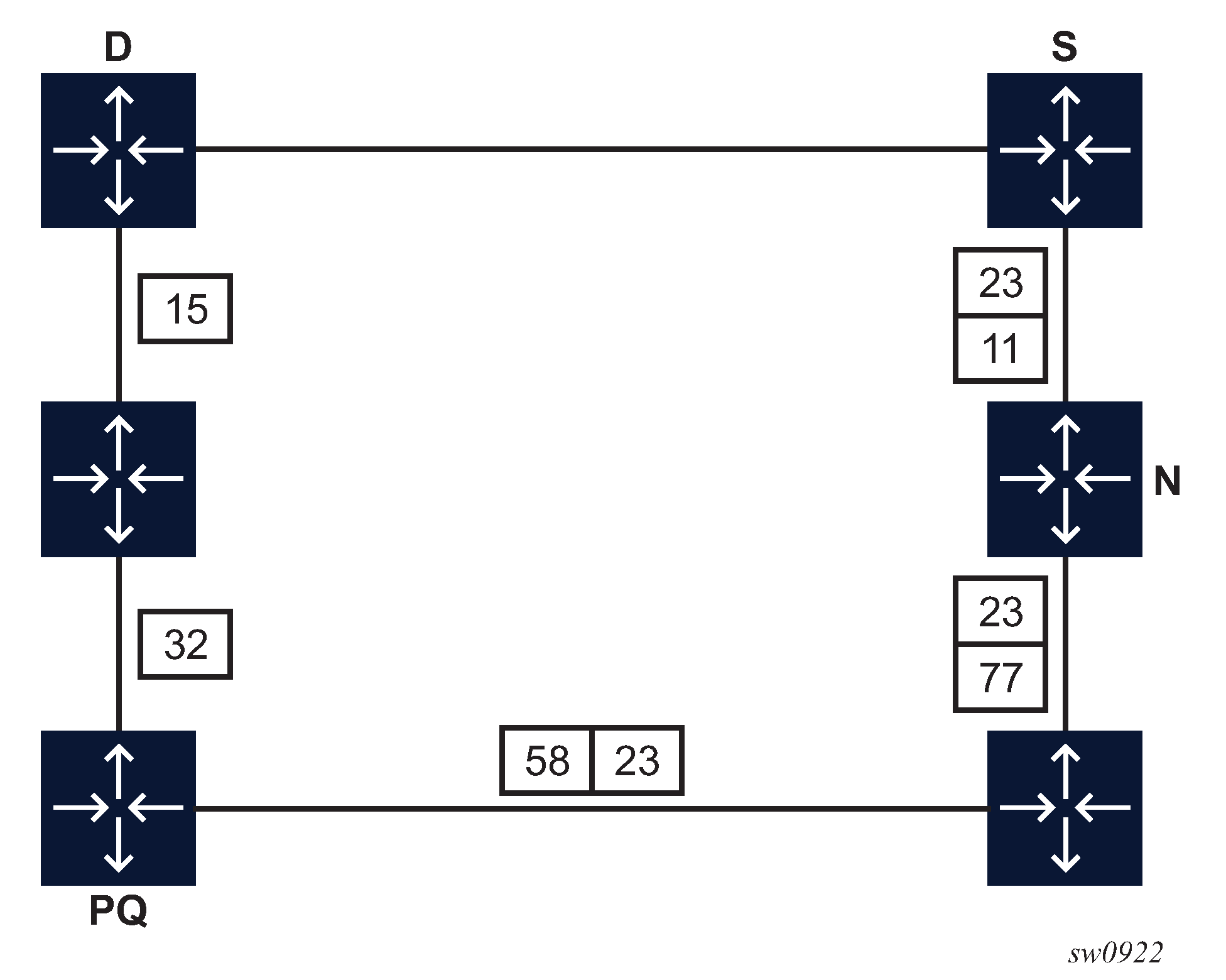LDP remote LFA (RLFA) builds on the existing segment routing (SR) RLFA capability to compute repair paths to a remote LFA node (or PQ node). After a link failure, RLFA puts packets back onto the shortest path without looping them back to the node that forwarded them. See the SR Linux Segment Routing Guide for more information about RLFA computation.
