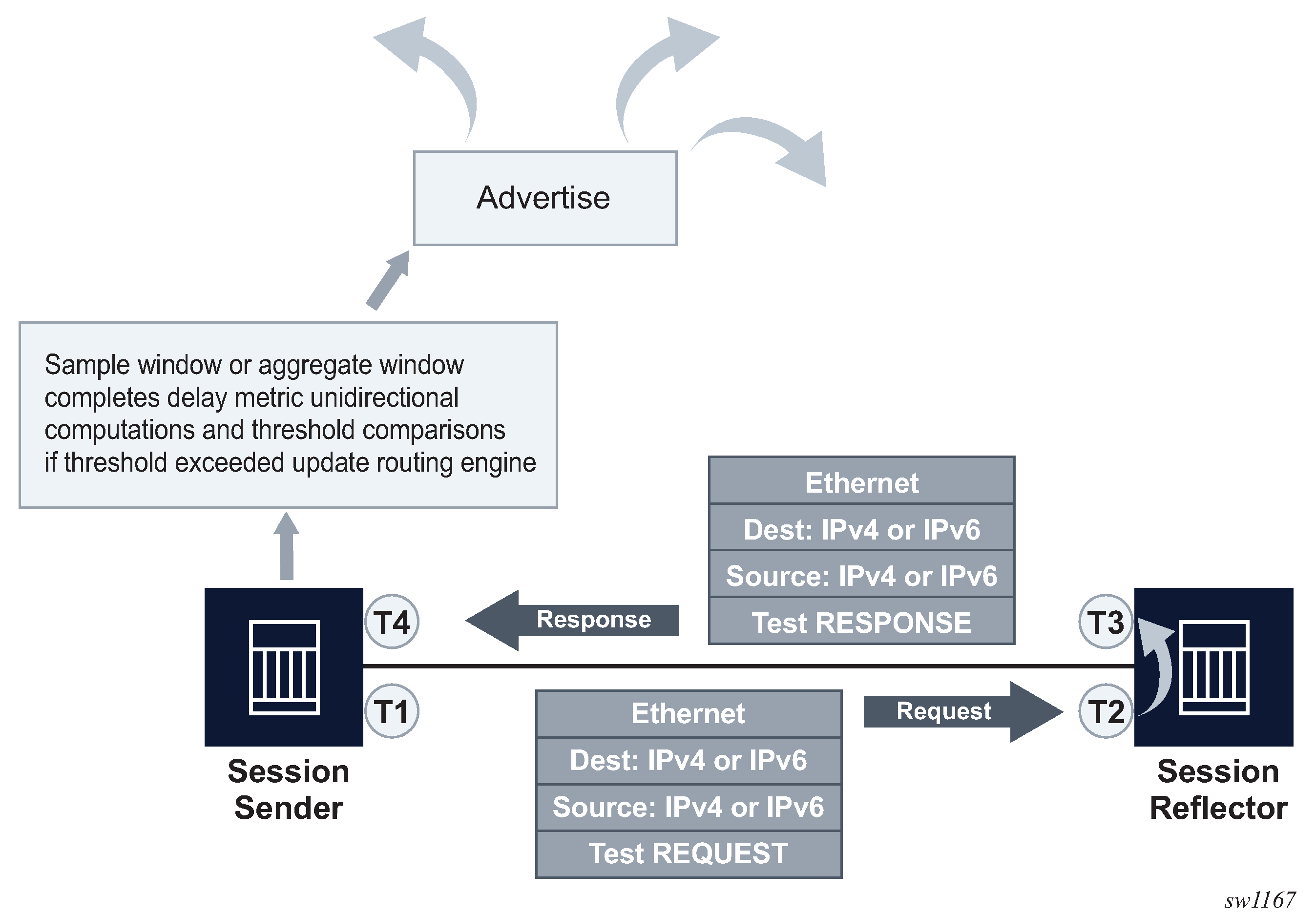 Thresholding compares the measurement window result to the delay measurement last reported at the end of the successful (completed) measurement window. Reporting is on a per-threshold, per-measurement window basis. If multiple thresholds are reached for a completed measurement window, only one threshold triggers an update to the routing engine.
