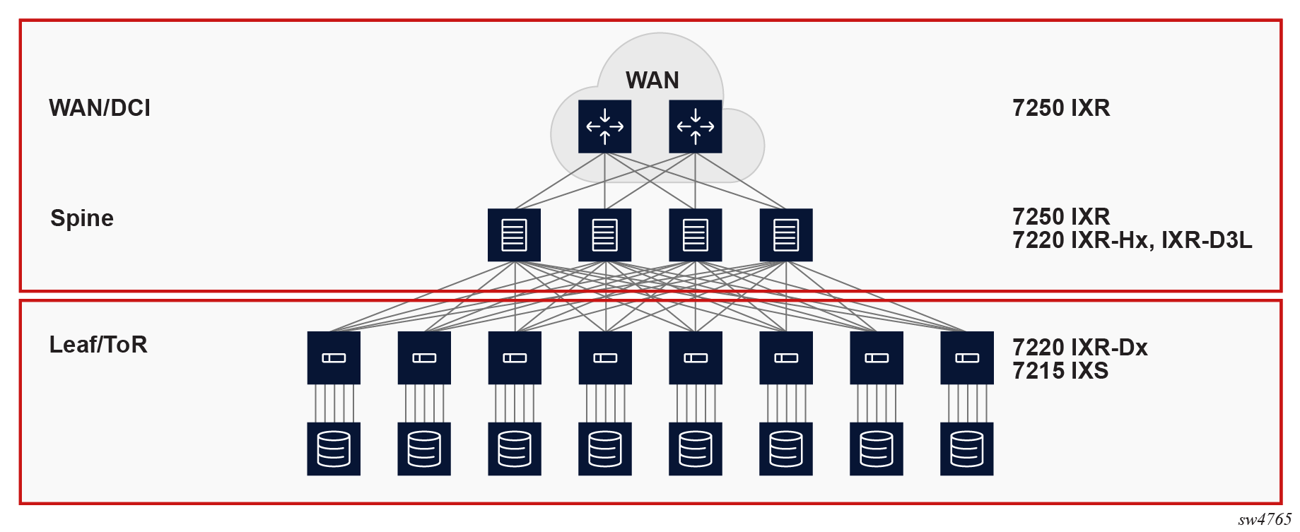 SR Linux is supported on a variety of Nokia hardware platforms that can be deployed in the network as WAN/data center interconnect (DCI), spine, and leaf/top of rack (TOR) devices. The following diagram shows typical deployment for SR Linux hardware platforms.
