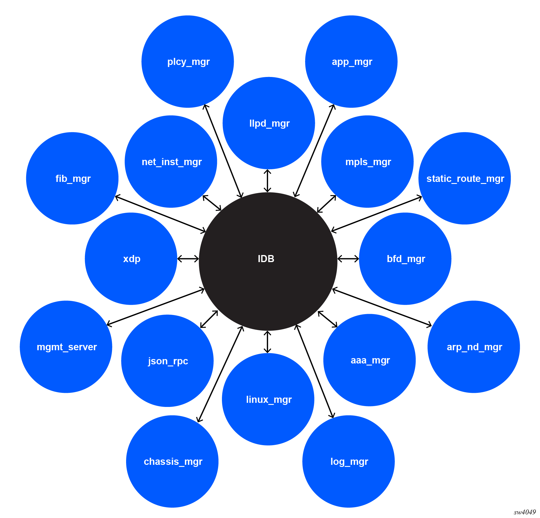 SR Linux is a suite of applications running like any others would in a Linux environment. The applications communicate with the IDB to process configuration and state. SR Linux applications and IDB shows the relationship between the IDB and the applications that run in SR Linux.