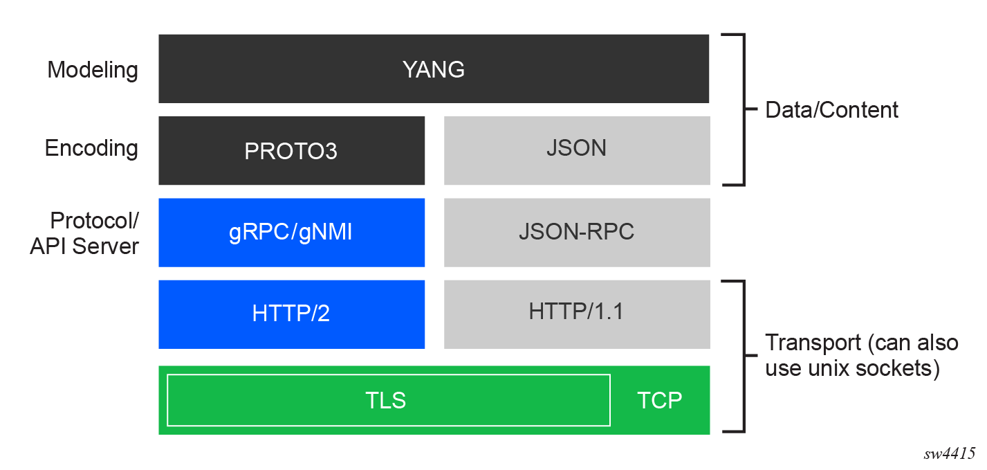 SR Linux can enable a gRPC server that allows external gRPC clients to connect to the device and modify the configuration and collect state information. You can also enable a JSON-RPC server on the SR Linux device, which allows you issue JSON-formatted requests to the device to retrieve and set configuration and state.