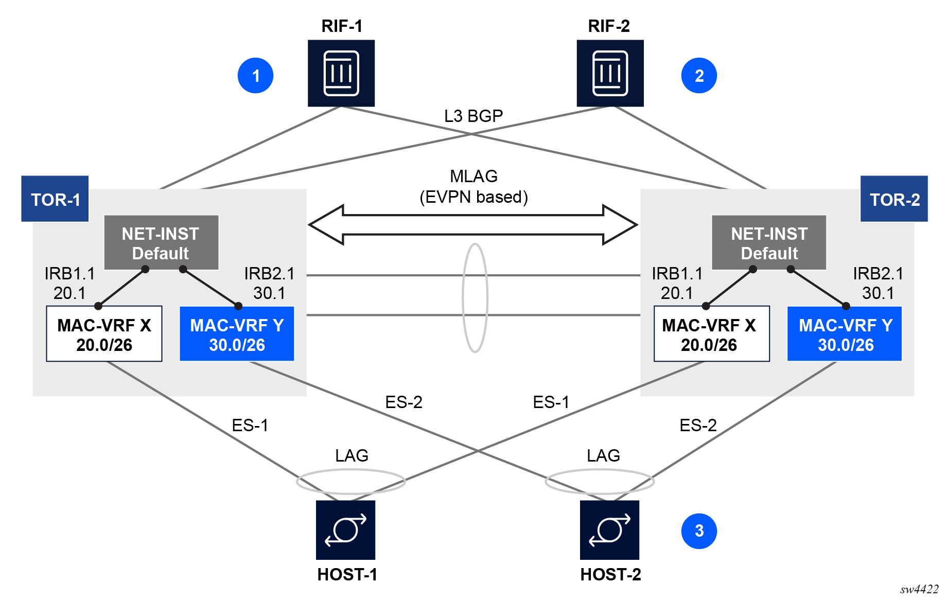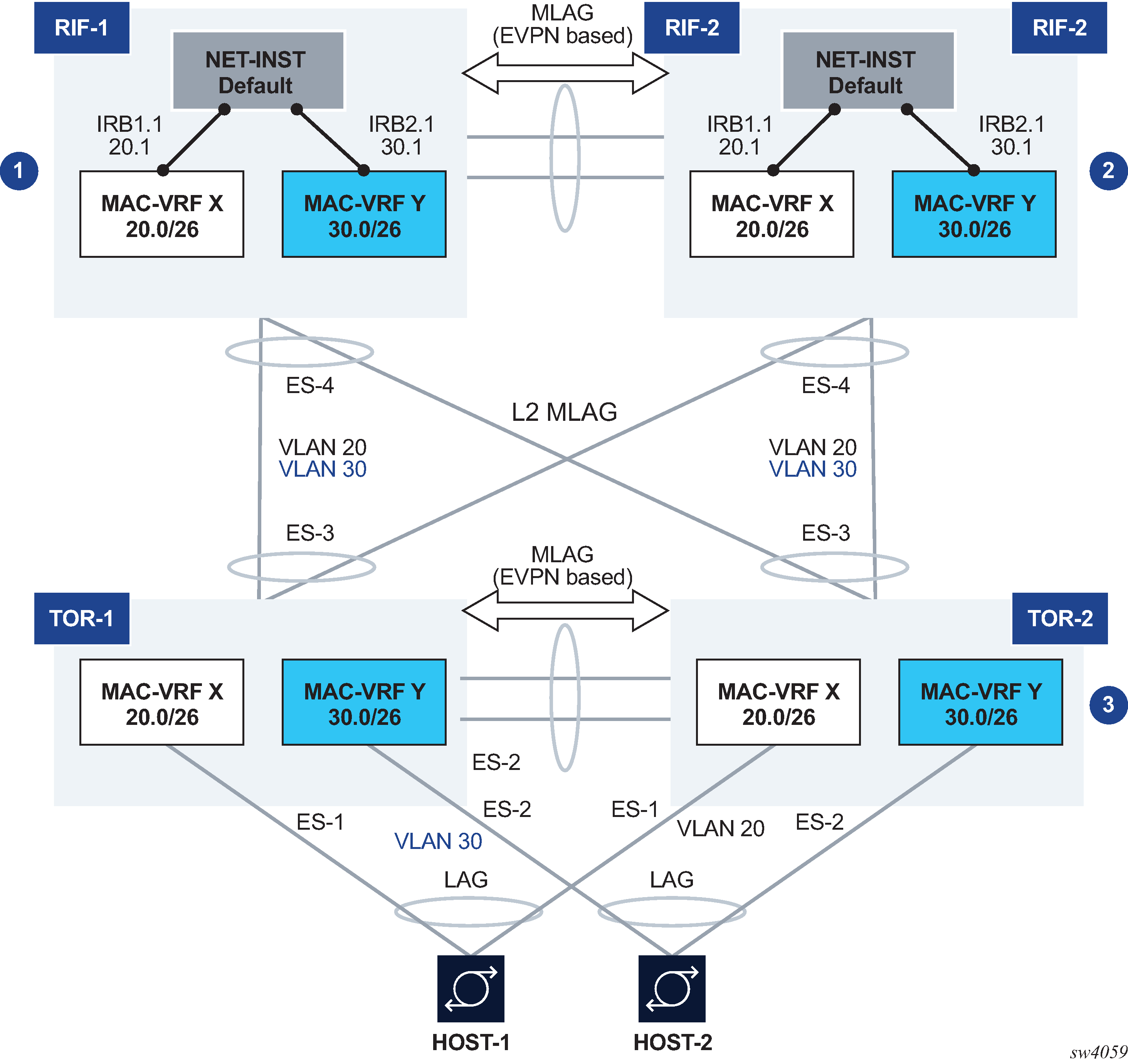 There are two multichassis pairs at the leaf and the spine levels.