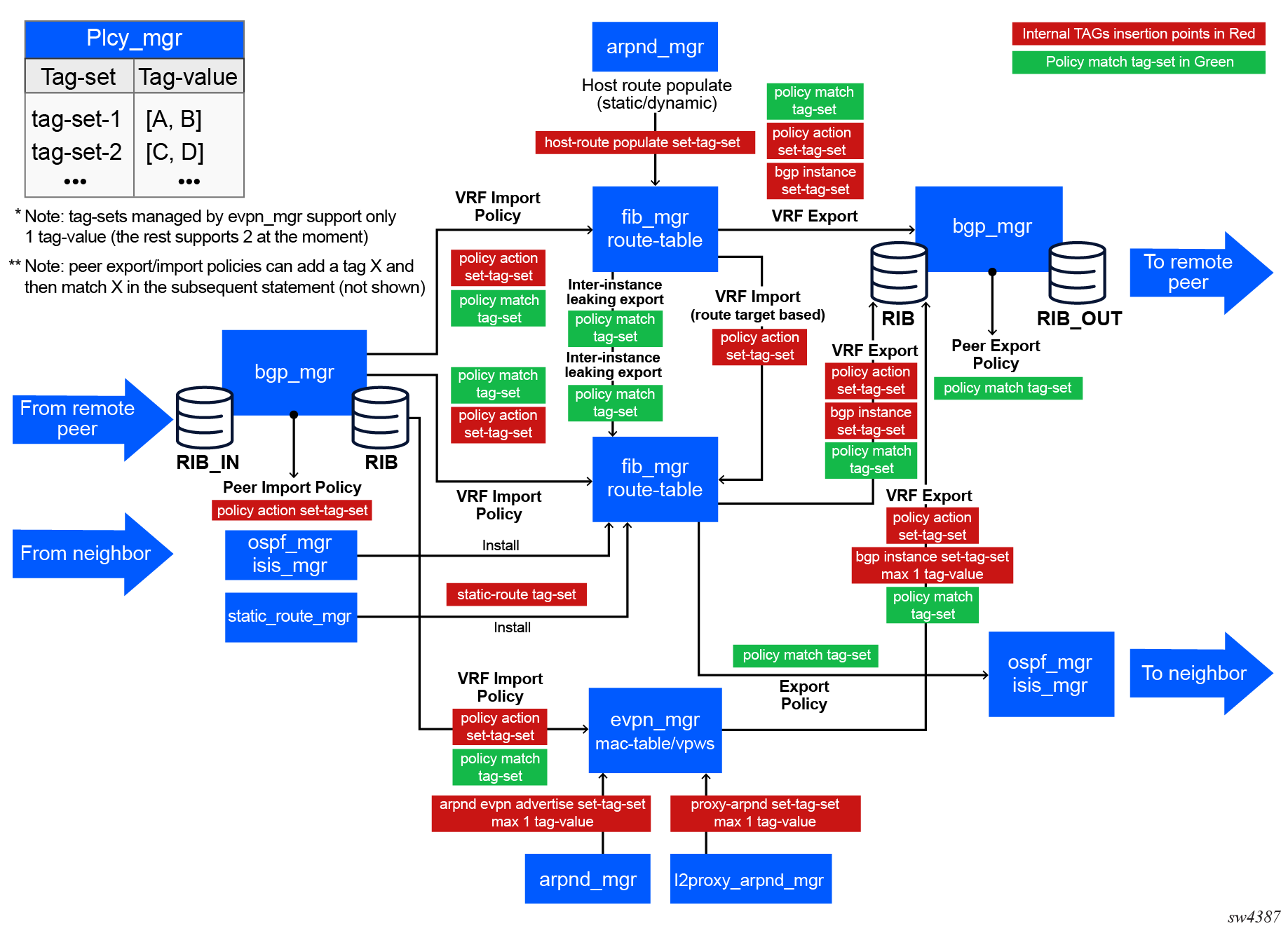The following diagram shows the SR Linux applications that can write an internal tag, insertion points for the internal tags, and the policy points where internal tag matching can take place.