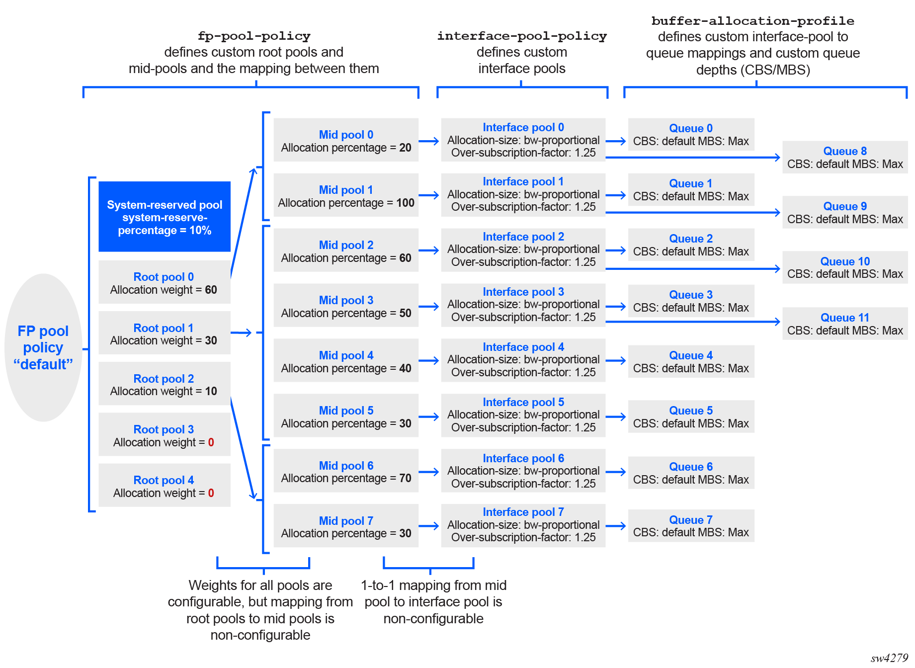 FP pool policies define the parameters for the system buffer root pools and mid-pools. All queues draw buffers from these pools as defined by the policies.