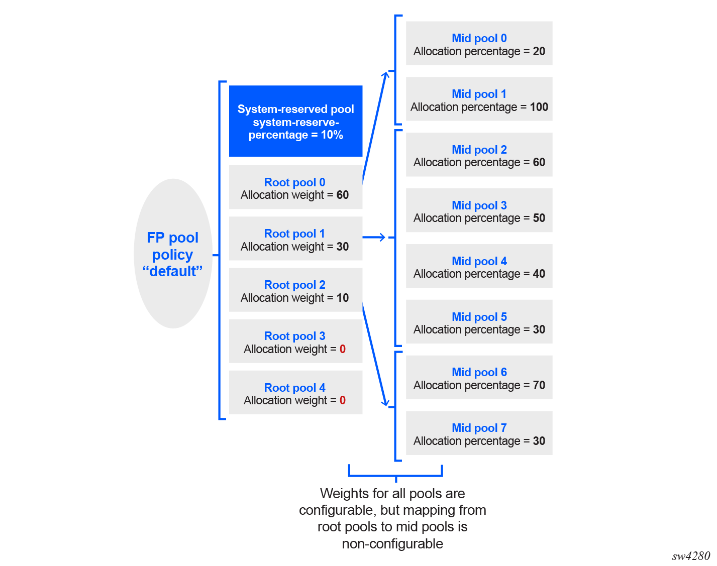 In addition to the default FP pool policy shown, two additional configurable FP pool policies can be defined, to support up to two forwarding complexes. Within all three policies, the individual pool allocation weights are configurable, however the mapping of root pools to mid pools is static and non-configurable.