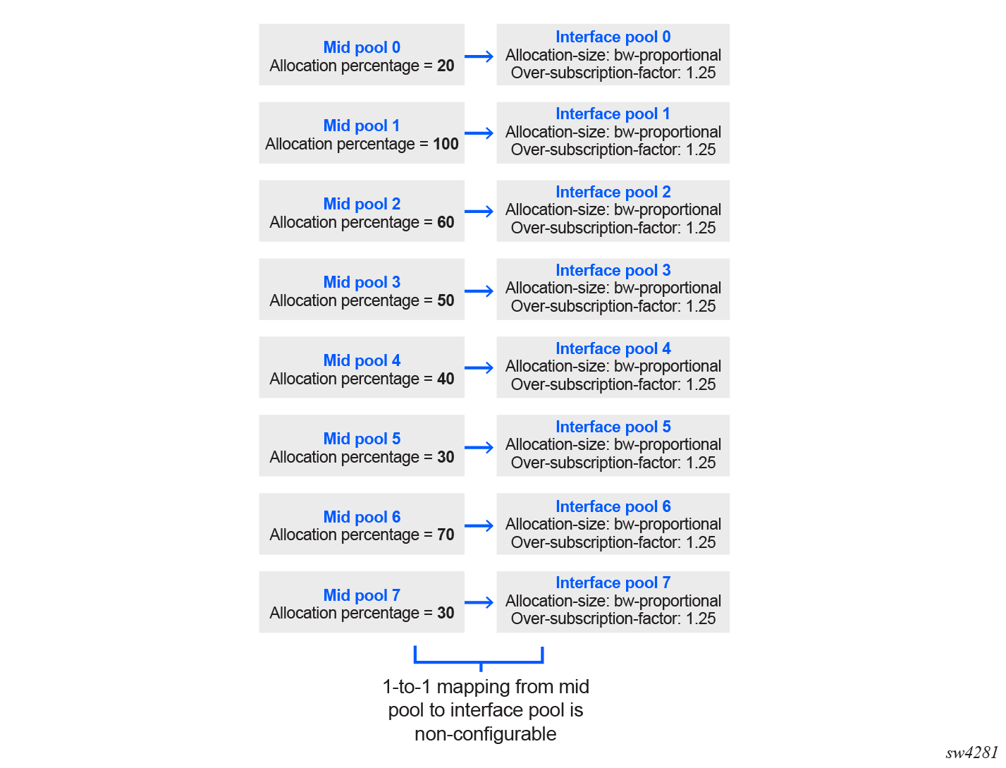 The bw-proportional parameter divides the mid-pool size between participating interface pools based on their respective administrative interface rate (the nominal share). The over-subscription-factor defines how much the interface pool share is increased relative to its nominal share.