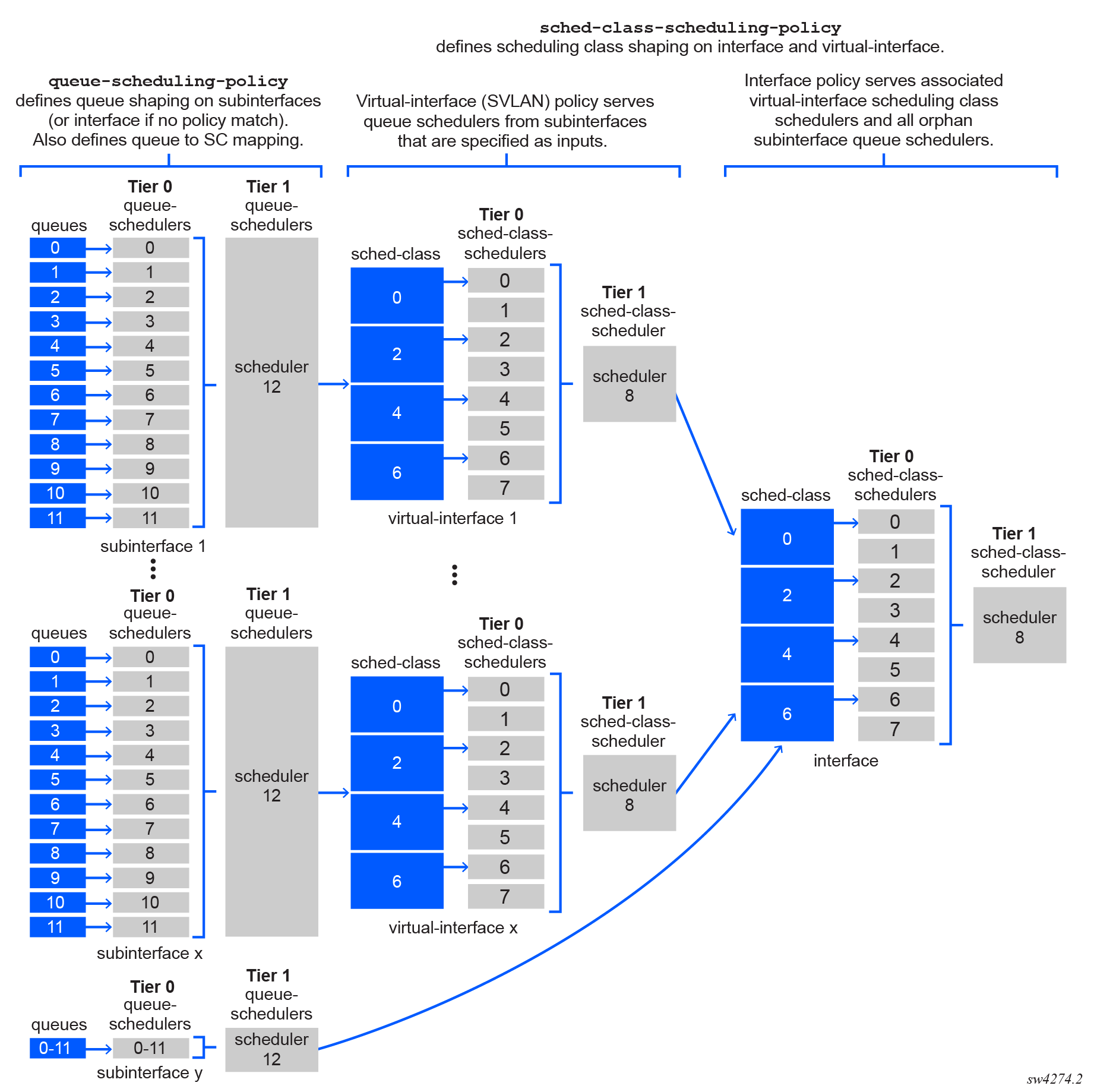 - Tier 0: Up to 8 schedulers, each of which can provide shaping for single or multiple scheduling classes. . The tier-0 schedulers distribute bandwidth among any child scheduler class schedulers and to child queue schedulers based on the scheduling hierarchy.