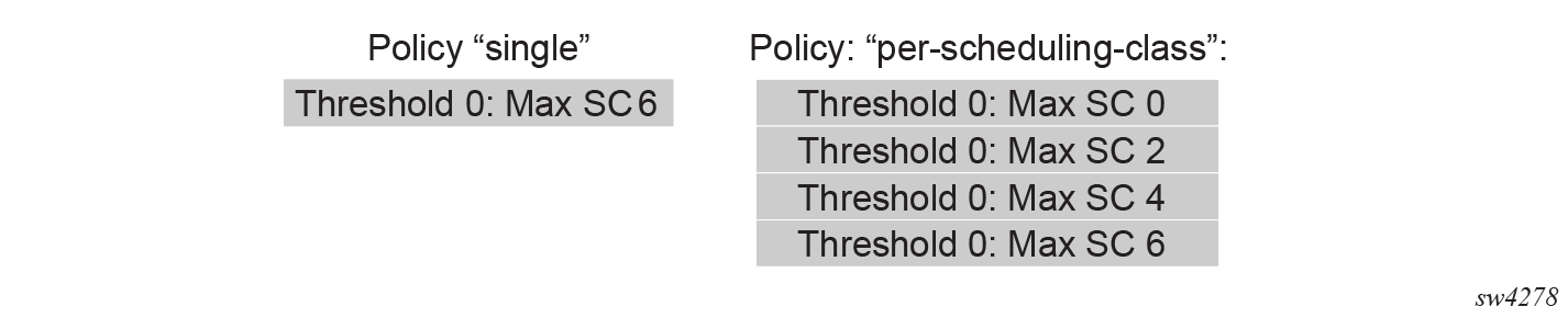The single scheduling threshold policy places all scheduling classes on the first threshold level, avoiding multiple priority levels and the corresponding increases in burst tolerance.
