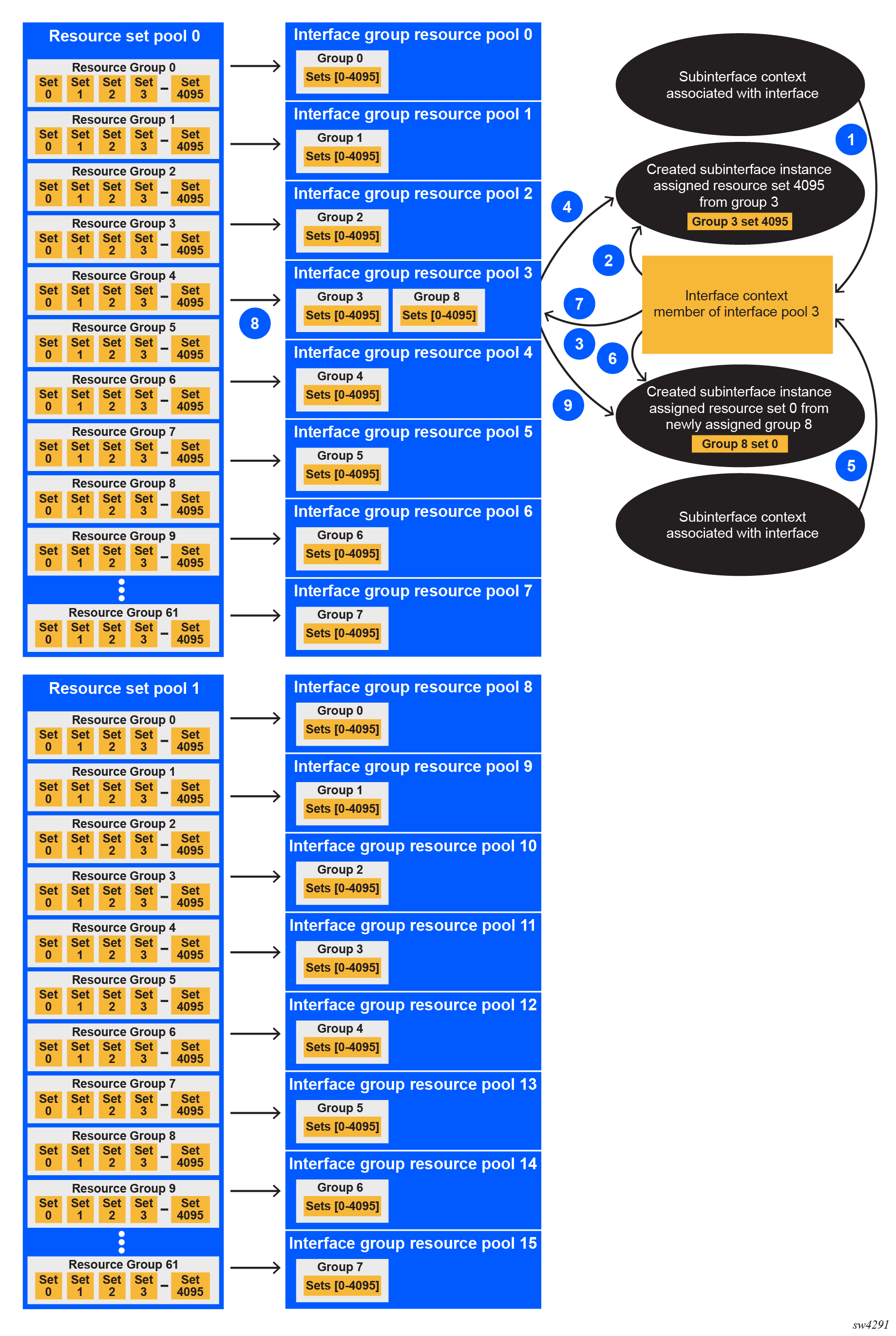 As the individual subinterfaces are created, the resource sets are allocated from the corresponding resource group. If a new subinterface is created and all resource sets in a group are already allocated, a new resource group is allocated to the interface group resource pool. This allocation is persistent, such that when a resource group is allocated to an interface group resource pool, it remains allocated even if all corresponding resource sets become free.