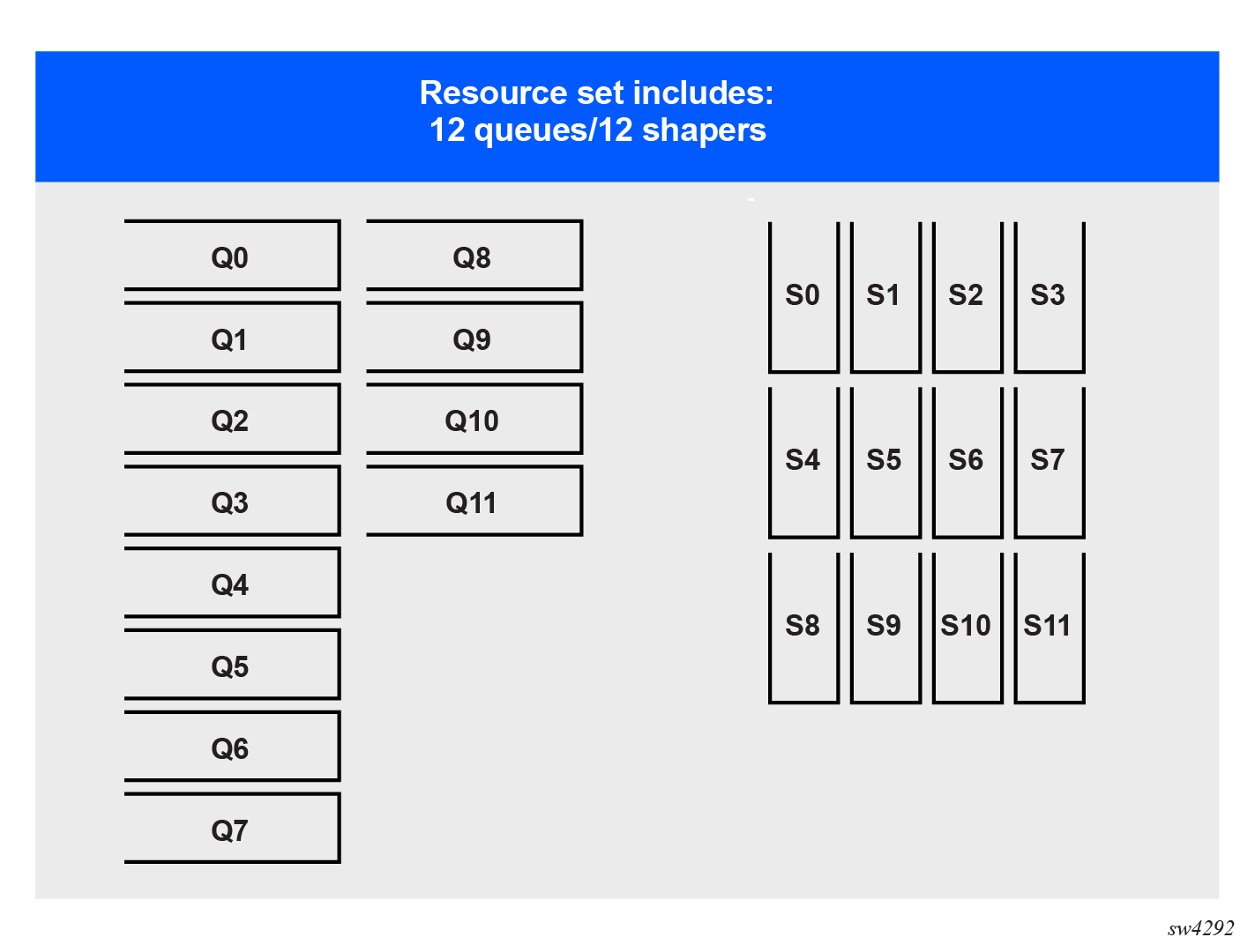 The resource management of output queues and tier 0 queue schedulers is based on resource sets consisting of: