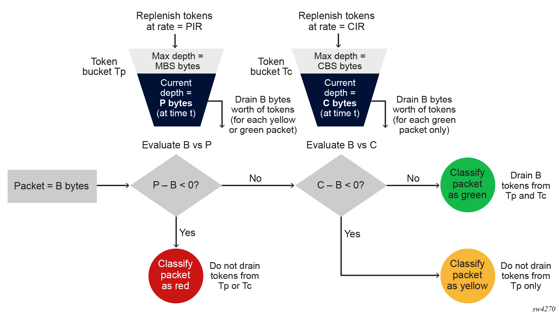 - If the packet is precolored as yellow or if C – B < 0, the packet is yellow (exceeding), and B bytes are drained from Tp.