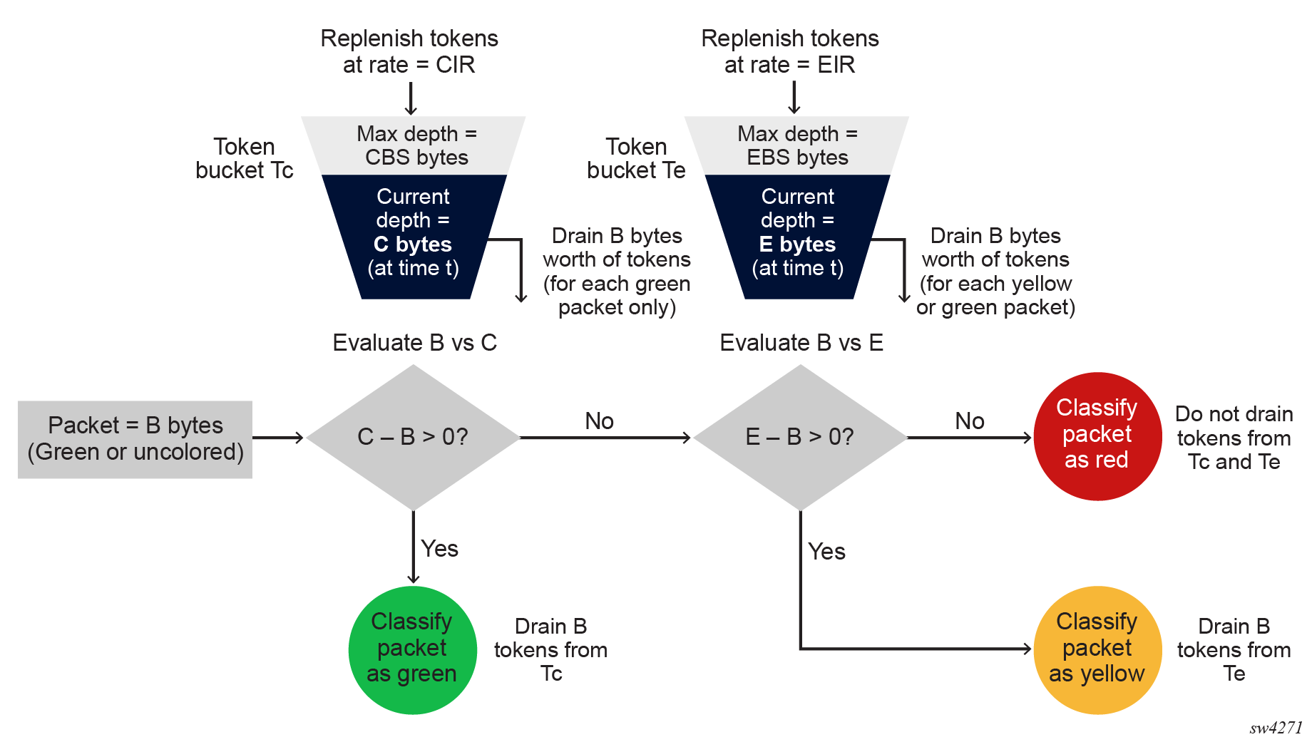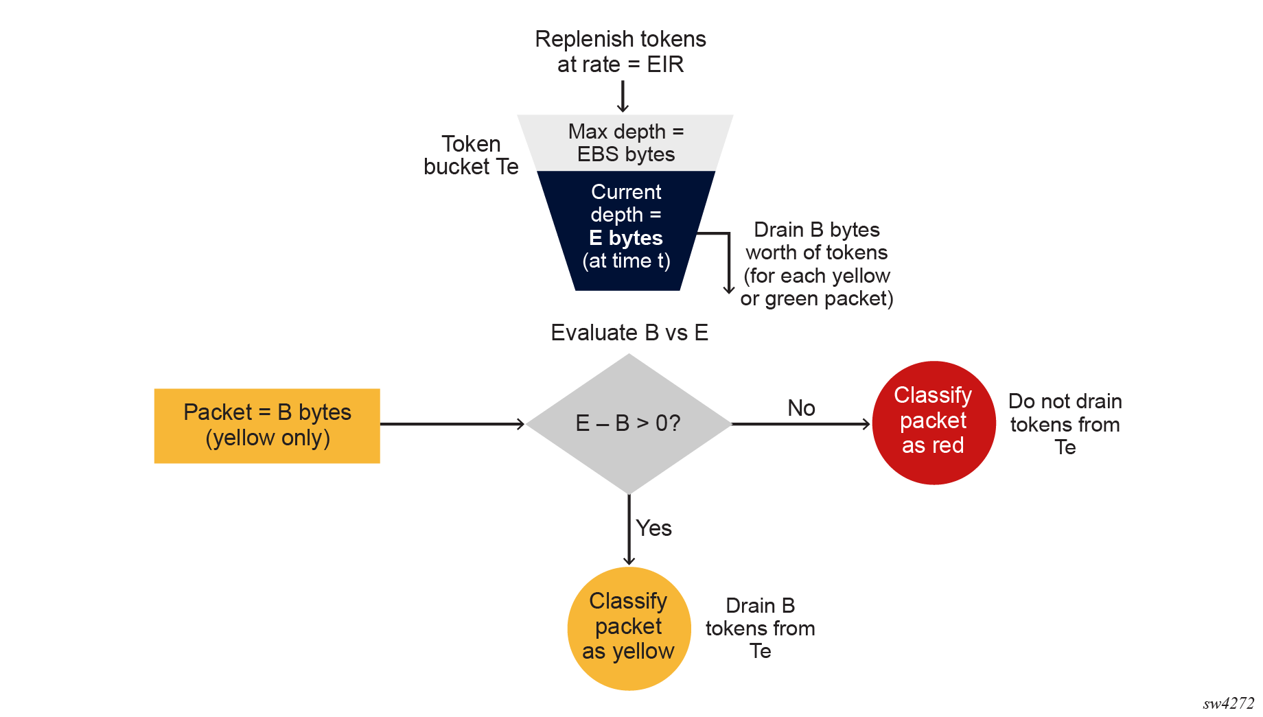 - If E – B > 0, the packet is yellow (exceeding), and B bytes are drained from Te.