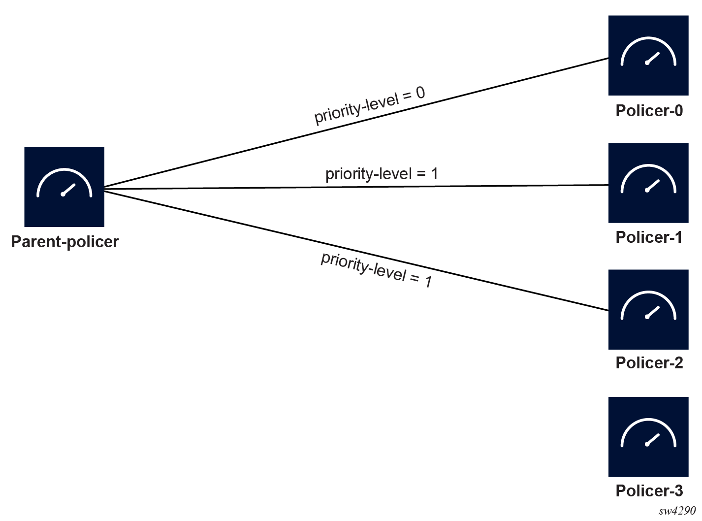 When the policers are parented by a parent policer, they can be assigned to one of six priority levels (0 to 5), with priority level 0 having the lowest priority. If two or more policers are assigned the same priority level, the bandwidth of the parent policer is distributed equally, provided all policers are receiving equal amounts of traffic.